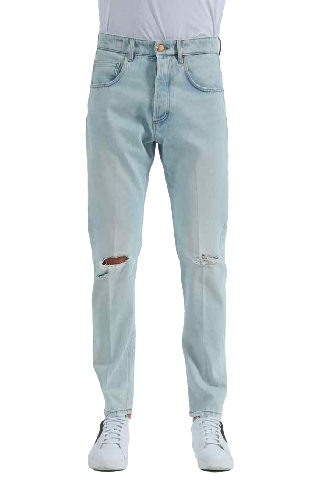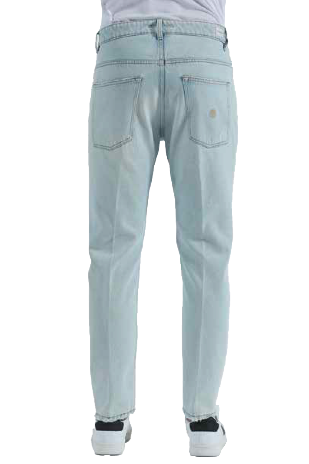Jeans uomo modello Boston linea Regular, colore chiaro, gamba comoda che scende dritta  dal ginocchio alla caviglia, lunghezza a copertura caviglia, Gold Rose Button quindi chiusura con bottoni bagnati all’Oro Rosa, tessuto  pregiato  100% cotone lavorato effetto logorato ed usura  alle tasche anteriori e posteriori, lavorazione a filato bianco aperte all’altezza ginocchio, entrambe le gambe ma in maniera diversa. Un jeans  per un look originale e grintoso ma soprattutto comodo!. Capo Made in Italy.