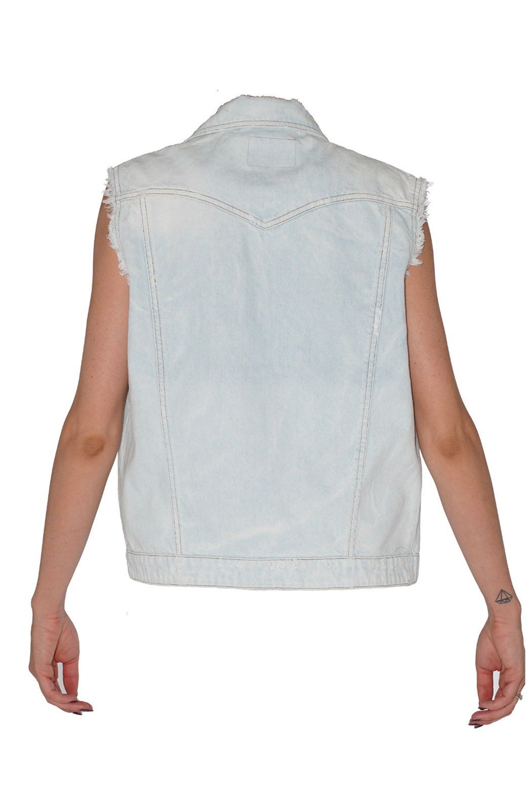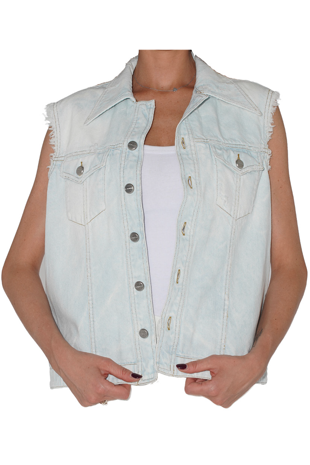 Gilet jeans collezione Primavera/Estate, tessuto in cotone lavorato ed effetto logorato, colore chiaro, capo molto bello e sicuramente molto comodo, nel guardaroba di chi ama vestire in jeans,è un capo che non può mancare.