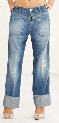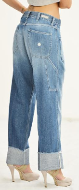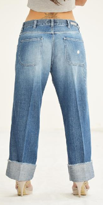 Jeans modale donna linea comoda e larga, modello a palazzo che scende dritto, lunghezza sopra la caviglia (dipende anche dall’altezza di chi lo indossa),colore medio chiaro, lavorato, chiusura nel fondo con risvolto.
